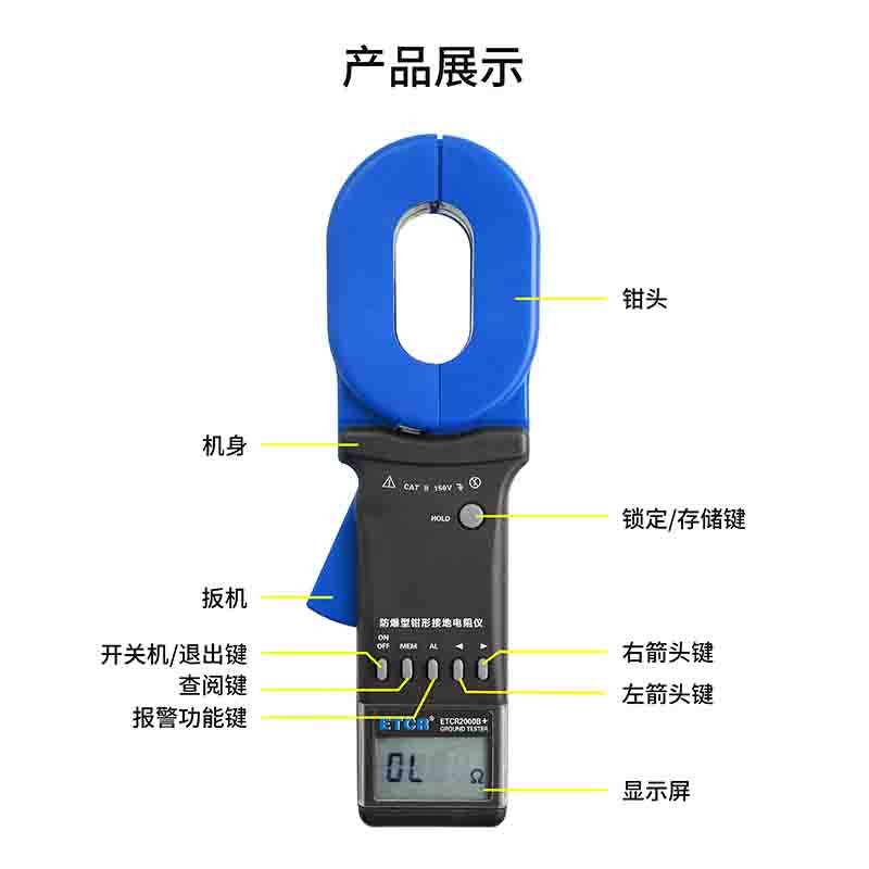 ETCR2000B+防爆型鉗形接地電阻儀又稱防爆型接地電阻表、防爆型鉗形接地電阻測試儀,用于接地電阻、回路電阻測量、接地故障判斷。在測量有回路的接地系統(tǒng)時(shí),不需斷開接地引下線,不需輔助接地極,安全快速、使用簡便。鉗形接地電阻儀廣泛應(yīng)用于電力、電信、氣象、油田、建筑及工業(yè)電氣設(shè)備等的接地電阻測量、回路電阻測量。長鉗口特別適宜于扁鋼接地的場所。