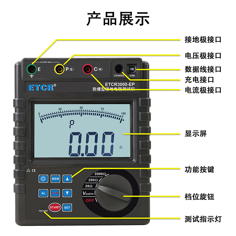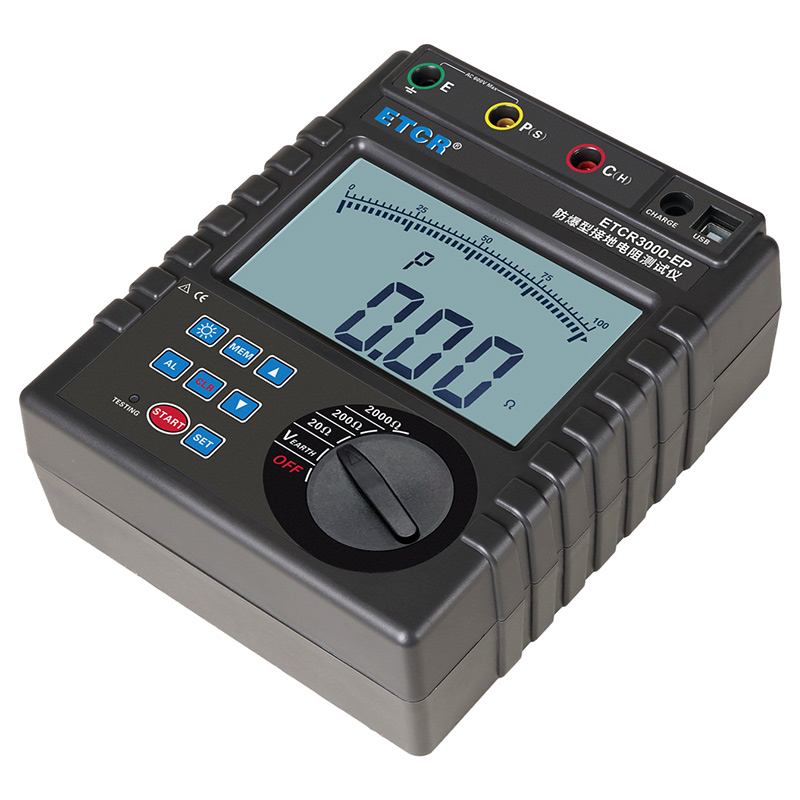 ETCR3000-EP防爆型接地電阻測(cè)試儀又稱接地電阻表、數(shù)字接地電阻表、地樁式接地電阻儀、接地?fù)u表,用于接地電阻測(cè)量、接地電壓測(cè)量,儀表采用數(shù)字及微處理技術(shù),精密3線或簡(jiǎn)易2線法測(cè)量接地電阻,其廣泛應(yīng)用于電力、電信、氣象、建筑、防雷及工業(yè)電氣設(shè)備等行業(yè)。