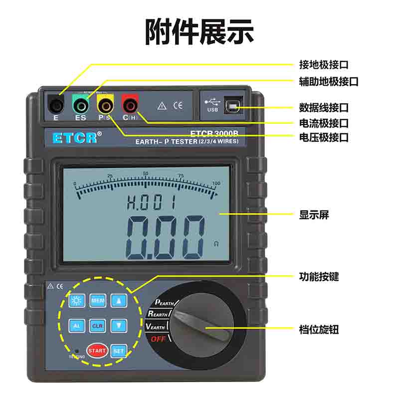 ETCR3000B接地電阻/土壤電阻率測(cè)試儀由主機(jī)、數(shù)據(jù)上傳軟件、測(cè)試線、輔助接地棒、通訊線等組成。主機(jī)超大LCD顯示,白屏背光,棒圖指示,一目了然。存儲(chǔ)功能,存儲(chǔ)300組數(shù)據(jù),通過(guò)USB接口數(shù)據(jù)上傳軟件實(shí)現(xiàn)歷史查詢與在線實(shí)時(shí)監(jiān)測(cè)功能,動(dòng)態(tài)顯示,告警指示,具有歷史數(shù)據(jù)讀取、查閱、保存、報(bào)表、打印等功能。