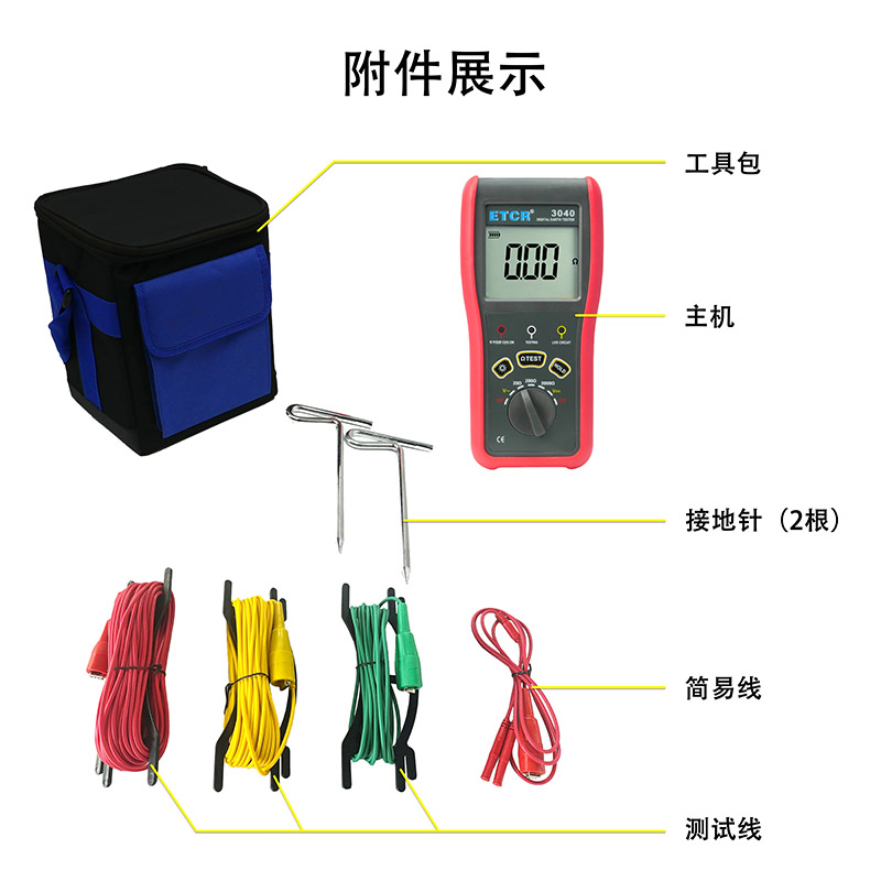 ETCR3040數字式接地電阻測試儀由主機、測試線等組成。具有自動關機功能、儀表全量程自動換擋、抗干擾能力強、操作更簡易。其廣泛應用于電力、電信、氣象、油田、建筑、防雷及工業(yè)電氣設備等的接地電阻測量。