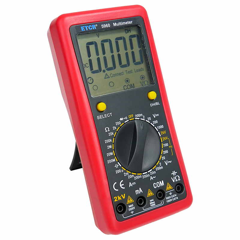 ETCR5960數字萬用表又稱數字萬能表、智能萬用表,是一種性能穩定、用電池供電的高可靠性數字萬用表,它用單片機管理,全功能有過載保護。儀表能顯示各檔表筆和插座應插的位置,提示您不要插錯位置。該儀表能測量直流電壓和電流、交流真有效值電壓和電流、電阻、電容、二極管正向壓降、電路通斷等。測量準確、性能穩定、安全可靠,是您理想的測試維修工具!