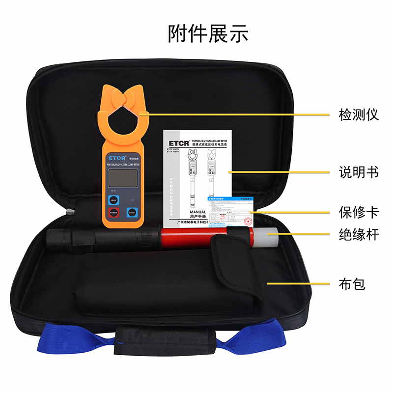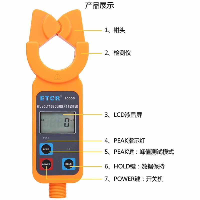 ETCR9000S便攜式高低壓鉗形電流表鉗頭與引導區創新的一體化設計,通過按壓或退拔絕緣桿能快速方便鉗夾或撤離被測導線,安全快捷。儀表還具有峰值保持、數據保持、數據存儲等功能。