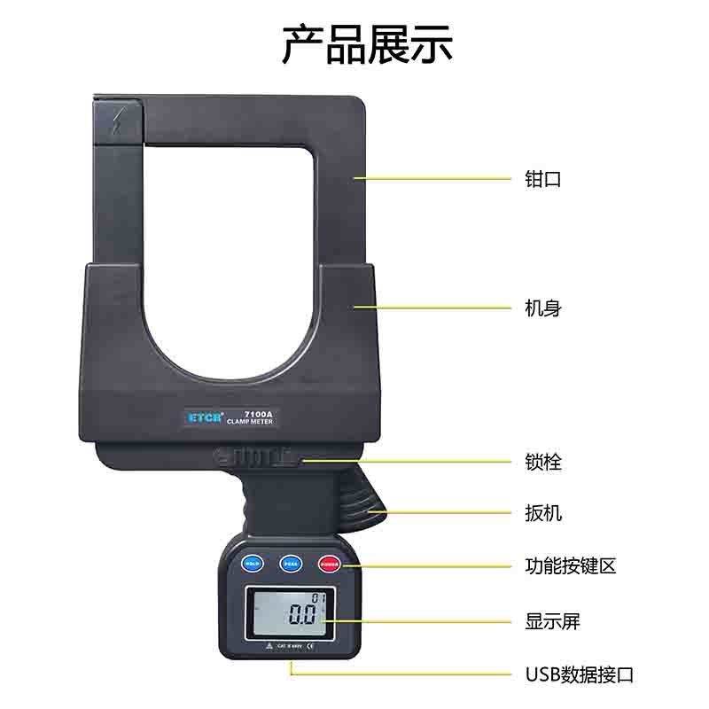ETCR7100A超大口徑鉗形電流表具有峰值保持、數據保持、數據存儲等功能。具有USB通訊功能,通過USB接口及上位機軟件可以在PC端在線實時監測,動態顯示最大、最小、平均值,具有報警值設定及報警指示功能,具有歷史數據讀取、保存、分析等功能。
