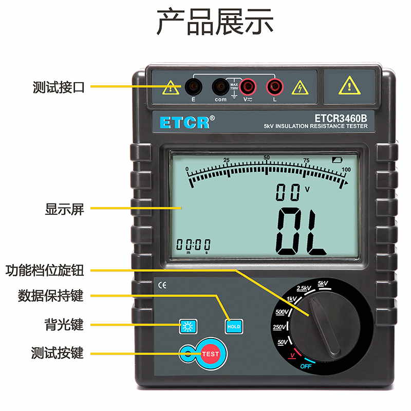 ETCR3460B絕緣電阻表50V、250V、500V、1000V、2500V、5000V0.1MΩ~1000GΩ2mA MAXAC/DC:0V~750V