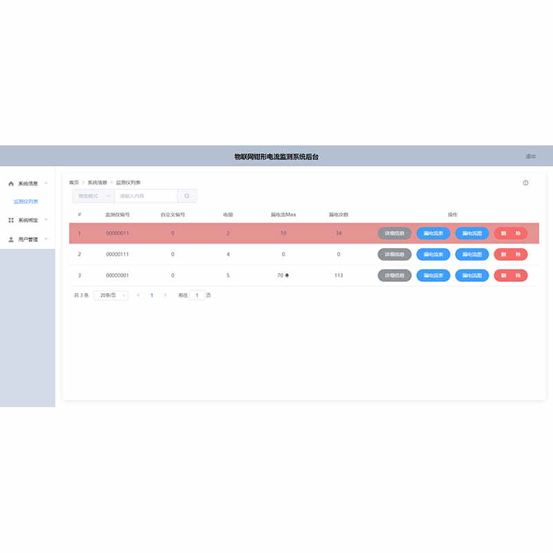 4、監測儀管理功能:通過賬號來高效管理監測儀,隨時更改簡要地址與安裝地點,使得每次監測都能夠保證漏電事件發生時準確的定位。可查看到賬號所綁定的監測儀臺數,并自動歸類監測儀類型,和該賬號最大綁定儀器數目等信息。