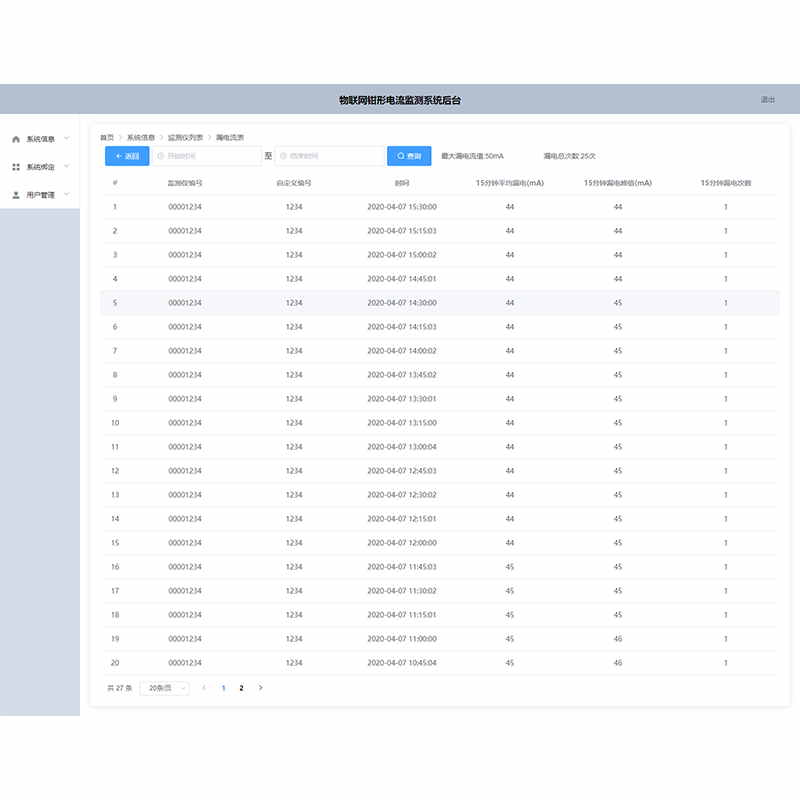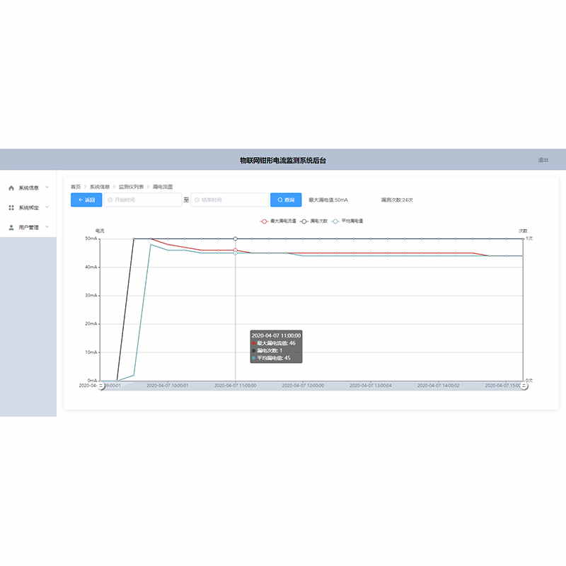 1、數據統計功能:系統對上傳數據進行統計,實現表格與折線圖兩種查看方式,實時監測并顯示最大電流值與漏電次數,便捷高效實用。在PC終端可通過時間按鍵快速查詢,該時間內的所有監測數據并以表格或折線圖兩種方式之一顯示出來。