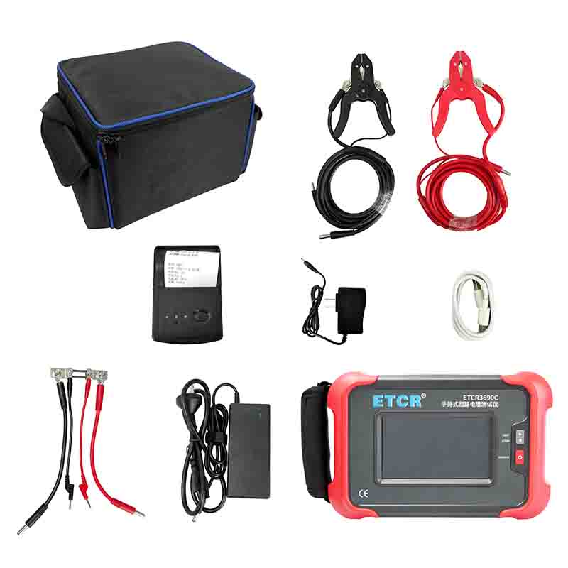 ETCR3690C手持式回路電阻測試儀由主機、監控軟件、測試線、電源適配器、USB通訊線等組成。儀表可存儲測試1000組數據,用戶可通過藍牙通訊讀取數據記錄,也可通過USB接口及上位機軟件將數據記錄上傳電腦,進行歷史數據讀取、查閱、保存等功能。儀表配置熱敏式打印機,可在現場打印測試結果。