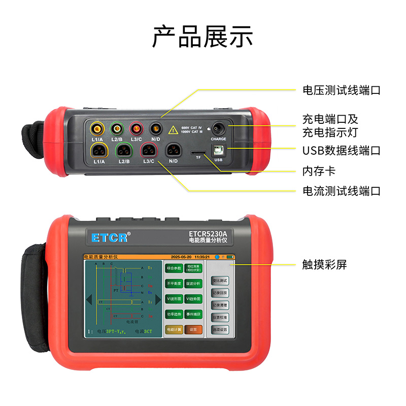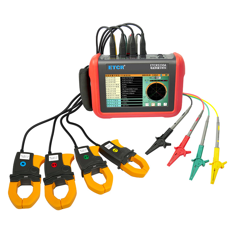 ETCR5230A電能質(zhì)量分析儀是我公司精心研制的一款專(zhuān)為現(xiàn)場(chǎng)測(cè)試三相電能質(zhì)量的高精度綜合型測(cè)試儀器。儀表具有智能化、功能完善、人機(jī)操作簡(jiǎn)潔、中英文雙語(yǔ)操作界面等特點(diǎn)。儀表采用7寸觸摸彩屏、體積小重量輕、攜帶方便,可選配多款電流鉗。儀表可同時(shí)測(cè)量4路電流(ABC三相及中性線(xiàn)電流),3路電壓、三相不平衡度、有功功率、無(wú)功功率、視在功率、諧波比、總諧波失真度等;顯示電流電壓的實(shí)時(shí)波形、相量圖;動(dòng)態(tài)捕捉電壓電流瞬時(shí)變化,監(jiān)測(cè)啟動(dòng)電流,監(jiān)測(cè)各電力參數(shù)并生成告警列表,長(zhǎng)時(shí)間記錄測(cè)試數(shù)據(jù)并生成趨勢(shì)曲線(xiàn)圖等功能。