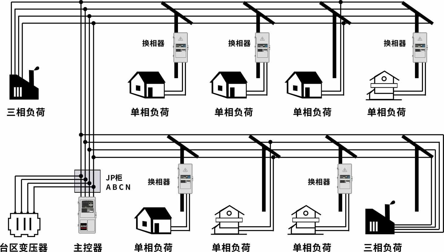 治理一個臺區需根據臺區變壓器容量及不平衡的嚴重程度,配置一臺主控器及若干臺換相開關。換相開關接收主控器發出的指令將單相負荷在三相之間切換,切換過程不中斷供電,不會影響用戶用電。從而有效解決配網中三相負荷不平衡問題。