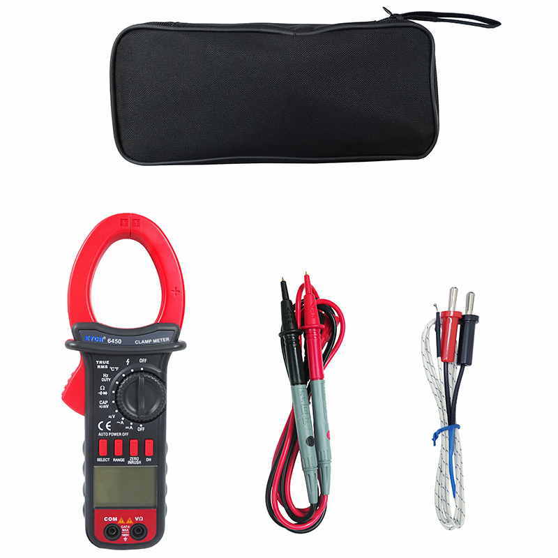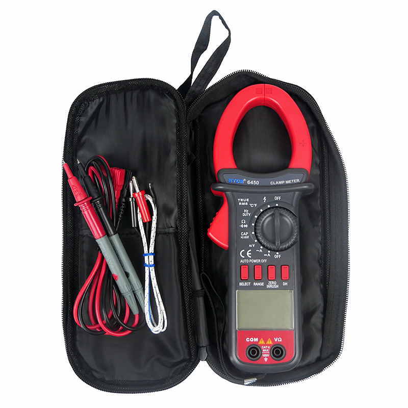 ETCR6450鉗形萬用表又稱多功能鉗形電流表,儀表采用高性能的新型MCU處理器,儀表具有極高的性價比,它具備高可靠性、高安全性、自動量程、手持式鉗形表等特點。具有超大屏幕數(shù)字,全量程過載保護(hù),數(shù)據(jù)保持、欠壓提示、自動關(guān)機(jī)功能,真有效值測量能準(zhǔn)確測量變頻電壓,非正弦波電壓,浪涌電流能測量周期為80mS的浪涌電流有效值,再配有能準(zhǔn)確測量-50~1000℃的溫度測量功能,使本儀表非常適合變頻電源、空調(diào),冰箱等制冷設(shè)備,電機(jī)性能檢測等, DC40A、400A、1000A量程的直流電流功能廣泛適用于電鍍,直流焊機(jī)、汽車檢測及各種直流500mA以上電流測量場合。