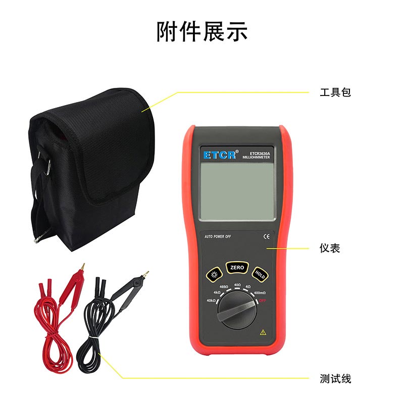 ETCR3630A便攜式毫歐計又稱直流低電阻計、直流電阻測試儀,歐姆計,儀表采用微處理機技術,四線法測試,安全精密可靠。主要用于測量電纜的導線電阻,開關、接插件、繼電器的接觸電阻,線圈、電動機、變壓器繞組的直流低電阻,金屬鉚接件金屬構件之間,地網地極連接導體間的聯接電阻。儀表廣泛應用于工礦企業、建筑監測監理公司、建筑施工單位、防雷公司、電力部門、船舶機車廠等。ETCR3630A便攜式毫歐計由主機、測試線組成。主機大屏LCD顯示,一目了然。能存儲1000組數據,電阻測量范圍:0.1mΩ~40.0kΩ,最大測試電流:100mA,儀表操作簡易,攜帶方便。