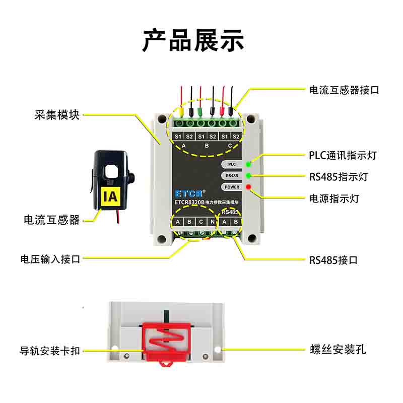 ETCR8320系列電力參數(shù)采集模塊用于現(xiàn)場(chǎng)在線(xiàn)實(shí)時(shí)監(jiān)測(cè)、記錄3路交流電流、交流電壓、無(wú)功功率、有功功率、視在功率、功率因數(shù)、畸變率、諧波、不平衡度、潮流方向等電力參數(shù)。采集模塊由采集器、開(kāi)口式互感器等組成。采集模塊可接入3路電流互感器、3路電壓。采集器具有RS485通訊功能,提供MODBUS通訊協(xié)議,便于用戶(hù)二次開(kāi)發(fā),B型具有PLC通訊。互感器有圓形、扁口、防水型等多種款式可供用戶(hù)選擇,開(kāi)口式結(jié)構(gòu)CT現(xiàn)場(chǎng)安裝時(shí)無(wú)需停電無(wú)需斷開(kāi)電纜線(xiàn),安裝方便安全。采集模塊體積小巧,特別適合安裝在JP柜、箱變電房等空間狹小的場(chǎng)所使用。采集模塊有2種安裝方式:螺釘安裝或?qū)к壈惭b。廣泛應(yīng)用在電氣裝置的交流電流、接地環(huán)流、交流電壓的在線(xiàn)監(jiān)測(cè),為用電檢查人員提供安全、準(zhǔn)確、便捷的電力參數(shù)。