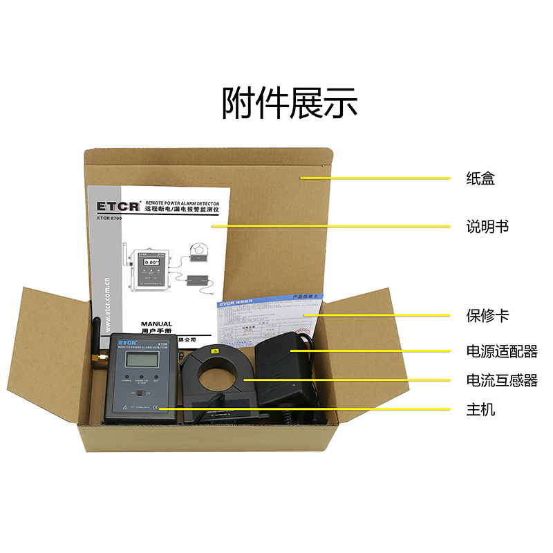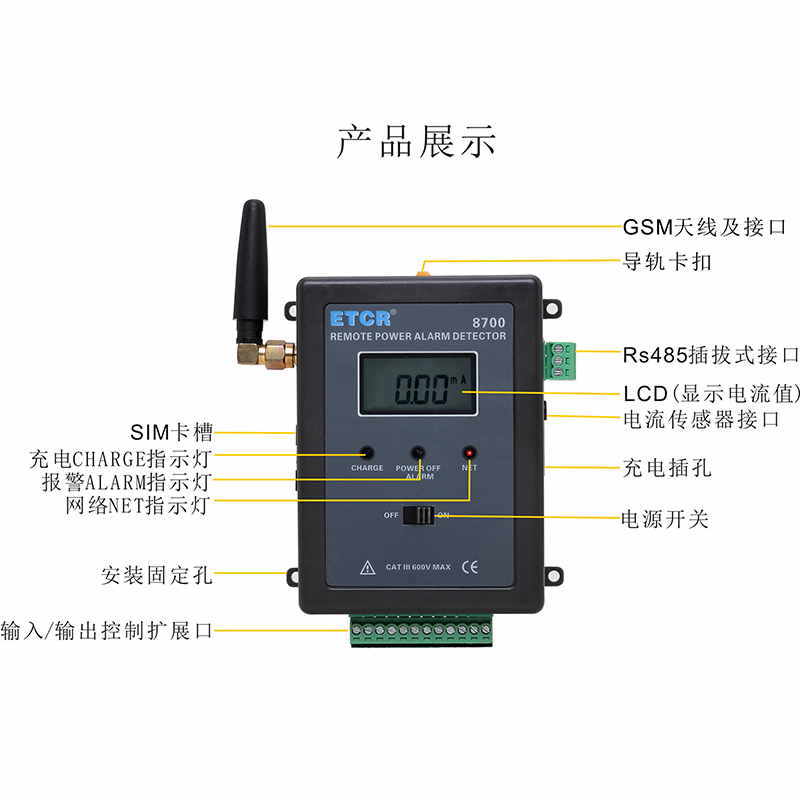 ETCR 8700遠(yuǎn)程斷電/漏電報(bào)警監(jiān)測(cè)儀又稱在線斷電報(bào)警器,用于需要無人值守和遠(yuǎn)程在線報(bào)警監(jiān)測(cè)斷電、恢復(fù)供電、漏電的工控現(xiàn)場(chǎng),屬工業(yè)級(jí)4G報(bào)警監(jiān)控儀,也可以當(dāng)防盜報(bào)警器使用。監(jiān)測(cè)儀由電腦、電流傳感器、GPRS模塊、上位機(jī)軟件、電源適配器等組成。內(nèi)置GPRS模塊,用戶只需通過自己電腦服務(wù)器設(shè)置幾個(gè)簡(jiǎn)單參數(shù),就可以隨時(shí)監(jiān)測(cè)遠(yuǎn)程設(shè)備是否斷電、是否恢復(fù)供電、是否有漏電等報(bào)警信息;也可以通過輸入擴(kuò)展口接入溫度、濕度、人體紅外感應(yīng)器等傳感器;還可以通過輸出擴(kuò)展口控制遠(yuǎn)程的繼電器等其他設(shè)備。廣泛適用于安防、電力設(shè)備、銀行、電信、工廠、鐵路、機(jī)房、不間斷電源、生物制藥、倉(cāng)庫(kù)、藥房、重要機(jī)械設(shè)備、24小時(shí)運(yùn)轉(zhuǎn)的生產(chǎn)線等各種需要斷電報(bào)警、漏電監(jiān)測(cè)報(bào)警、遠(yuǎn)程控制啟停等場(chǎng)所。
