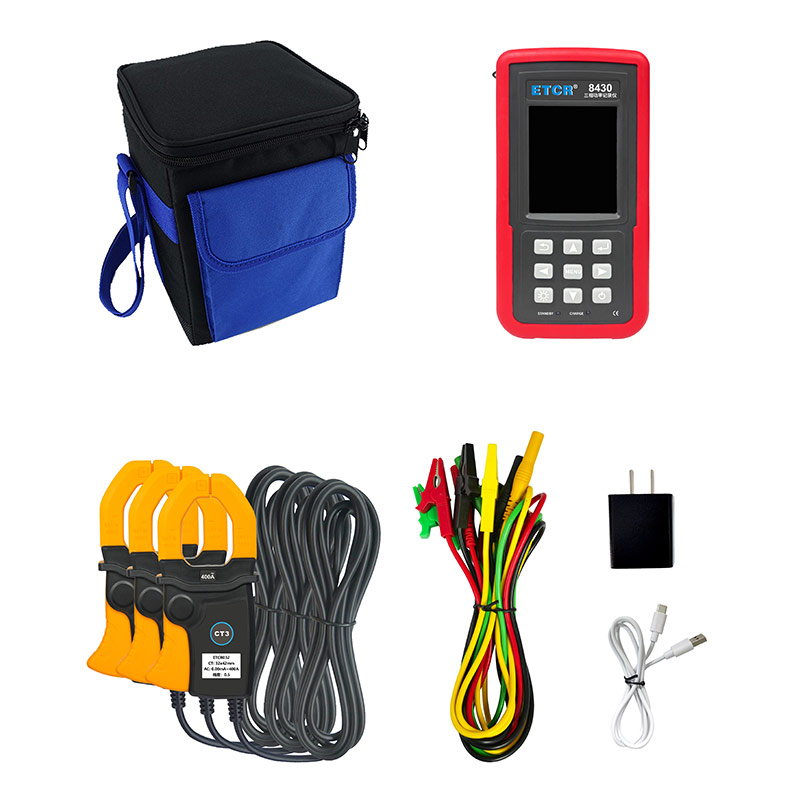 主機1件;互感器1個(ETCR8400)/3個(ETCR8430);電壓輸入線2條(ETCR8400)/4條(ETCR8430);數據線1個;電源適配器1個;工具包1件