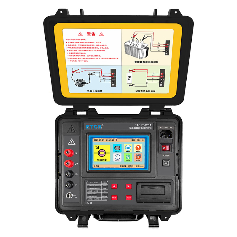 ETCR3670A變壓器直流電阻測試儀由主機、測試線、USB通訊線等組成,儀表采用微處理機技術,精密四線法測試,量程寬0.100mΩ~50.00kΩ,精度高0.2%,最高分辨率1uΩ,測量準確可靠。儀表具有自動測量及手動測量兩種測量模式,采用快速自動消磁技術,用戶無需在測試后另行消磁。儀表具有75℃溫度折算電阻計算功能,根據(jù)試品的溫度、材質進行補償折算。儀表采用5寸全彩高清觸摸屏,帶背光調節(jié)功能,強光下清晰可見。儀表帶有內(nèi)置打印機、藍牙通訊,USB接口。儀表還有自動放電功能,告警功能、時鐘功能等。是快速測量變壓器繞組直流電阻的理想儀表。