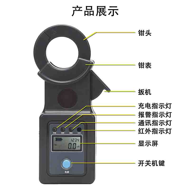 產品圖片產品型號名稱鉗口尺寸電流量程電源續航時間通訊方式防盜功能防護等級