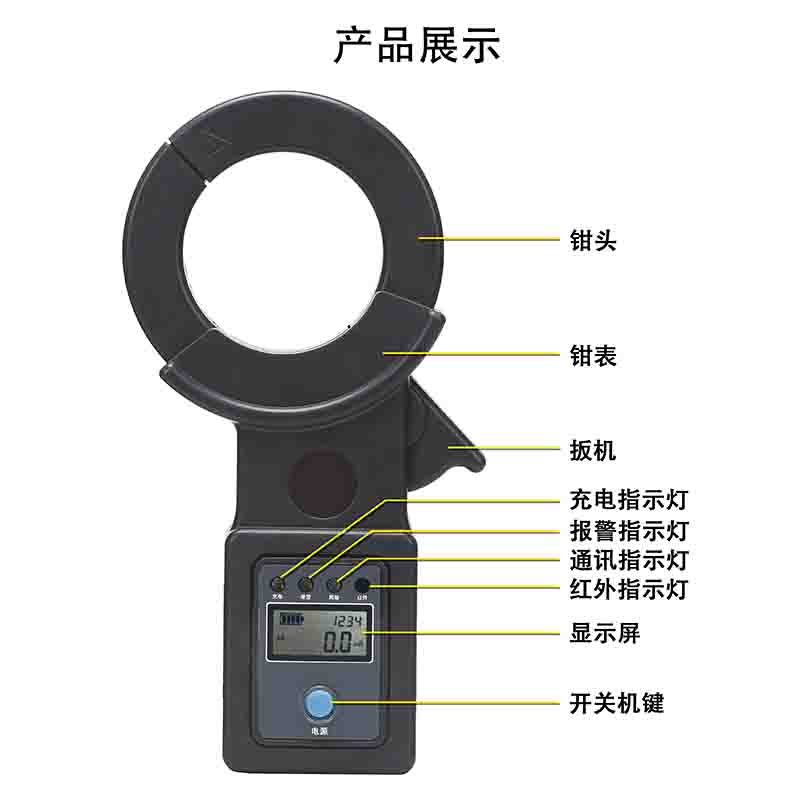 3、監測儀帶有液晶顯示屏(顯示:電流值、電池電量、監測儀編號、網絡信號強度)可做鉗形電流表使用,一機多用。