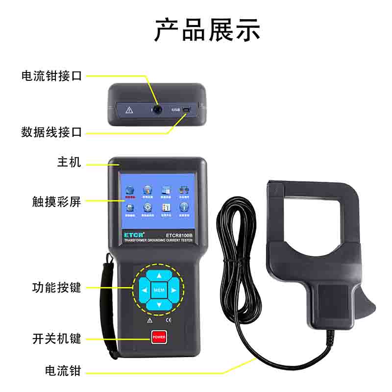ETCR8100B變壓器鐵芯接地電流測試儀采用高速微處理器,3.5寸彩色觸摸液晶屏,中文界面操作方便快捷。能實時顯示被測電流的大小及波形;具有報警臨界值設定及報警指示功能;具有日期時鐘及設置功能;具有自動關機功能;具有設定試品編號功能;具有USB接口,可將存儲數據導入電腦,儀表可以存儲數據及波形100組。