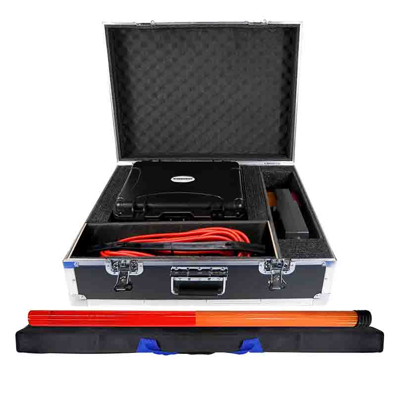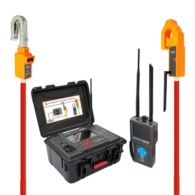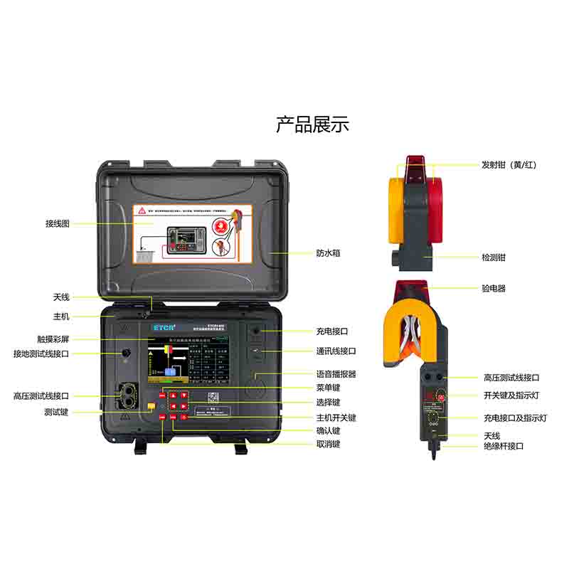 ETCR1400架空線路接地故障巡查儀又稱二分法架空線路接地故障查找儀、 架空線路單相接地故障定位儀、小電流接地故障定位儀、配網專用架空線路故障定位儀,儀器由主機、檢測鉗、測試線、接地針、絕緣桿及附件組成,主機與檢測鉗間采用無線通訊。主機采用7寸彩屏,故障指向清晰明了,測試結果一目了然,主機具有語音播報功能,語音提示線路故障方向,使得現場操作更加輕松。創新的檢測鉗集信號發射、采集于一體,鉗形結構,體積小,重量輕,掛裝方便,一次掛裝即可完成線路故障查找,操作簡易快速,極大減輕了測試的工作強度,提高工作效率。檢測鉗自帶非接觸驗電器,能檢驗電纜線是否帶電,并發出聲光報警,確保操作人員和設備的安全。儀器還具有藍牙通訊功能,USB通訊接口。
