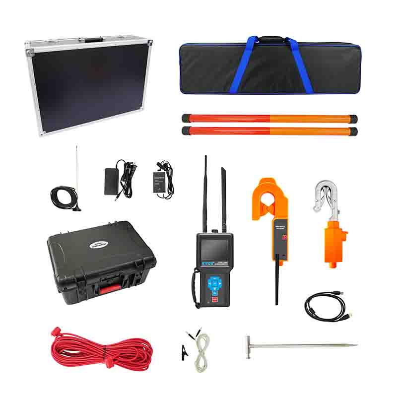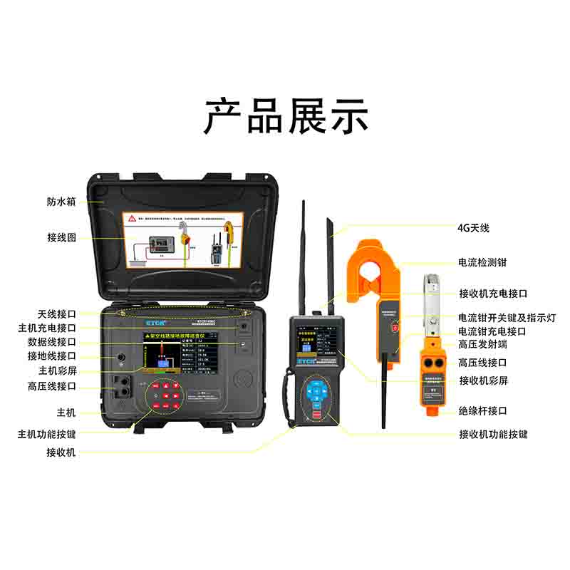 ETCR1400C架空線路接地故障巡查儀,由主機、電流檢測鉗、高壓發(fā)射端、接收機、測試線、接地針、絕緣桿及附件組成。主機與接收器之間為4G/LORA雙模通信,控制高壓信號輸出,同時將測試結(jié)果發(fā)出到主機。電流鉗與接收器之間為LORA通信,將電流鉗檢測到的信號發(fā)送到接收器。主機采用7寸彩屏,故障指向清晰明了,測試結(jié)果一目了然,接收機具有語音播報功能,測試結(jié)果、線路故障方向,使得現(xiàn)場操作更加輕松。電流檢測鉗及高壓發(fā)射端結(jié)構(gòu)緊湊,體積小,重量輕,掛裝方便,一次掛裝即可完成線路故障查找,操作簡易快速,極大減輕了測試的工作強度,提高工作效率。