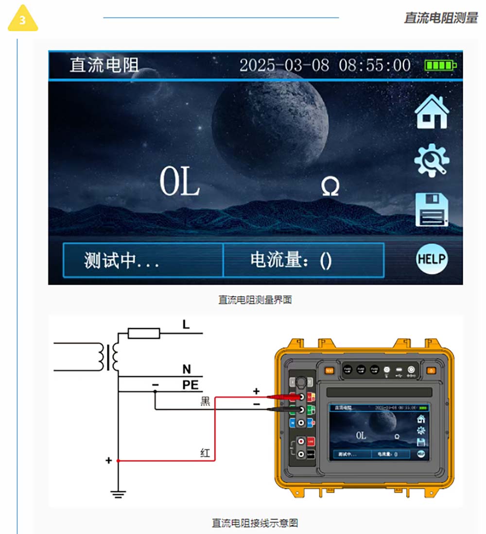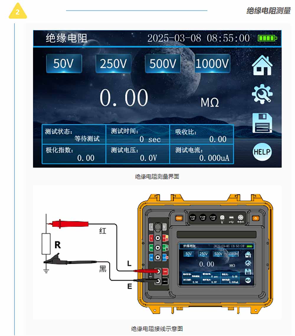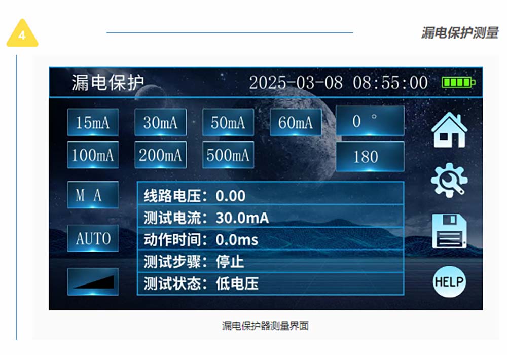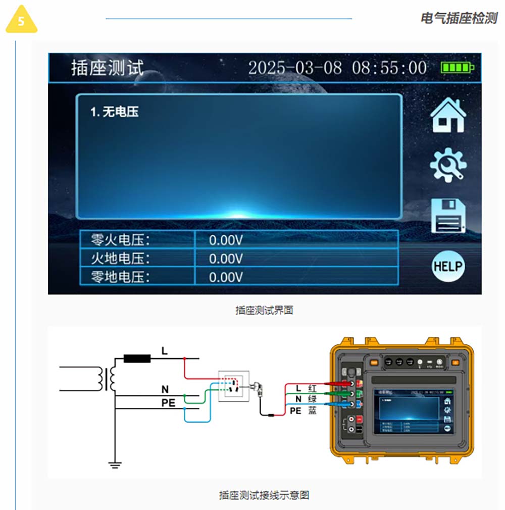 接地/絕緣/直流電阻測試、RCD漏電保護檢測、電氣插座檢測、電流有效值測試、交流電壓測試、相序測試等電力參數測試。